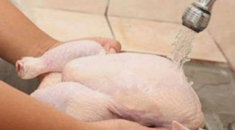 Μην το πλένετε: Το να ρίξετε άφθονο νερό στο ωμό κοτόπουλο δεν θα ξεπλύνει το καμπυλοβακτηρίδιο, τη σαλμονέλα, ή το E-coli. Το μόνο που καταφέρνετε είναι να διασπείρετε τους γεμάτους βακτήρια χυμούς του κοτόπουλου στις γύρω επιφάνειες (νιπτήρας, πάγκος κουζίνας κλπ) σε απόσταση ακόμα και μισού μέτρου από την βρύση. Αν θέλετε να το πλύνετε, κάντε το προσεκτικά χωρίς να πιτσιλίσετε πολύ.
