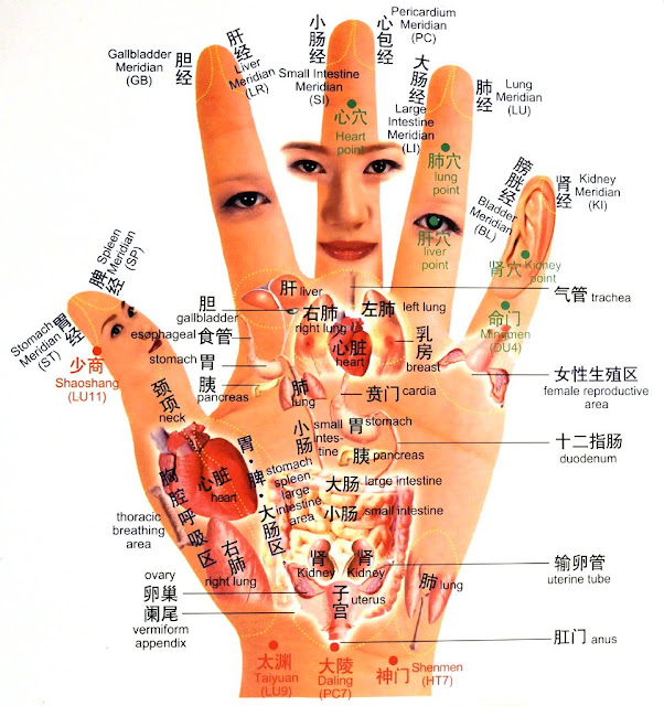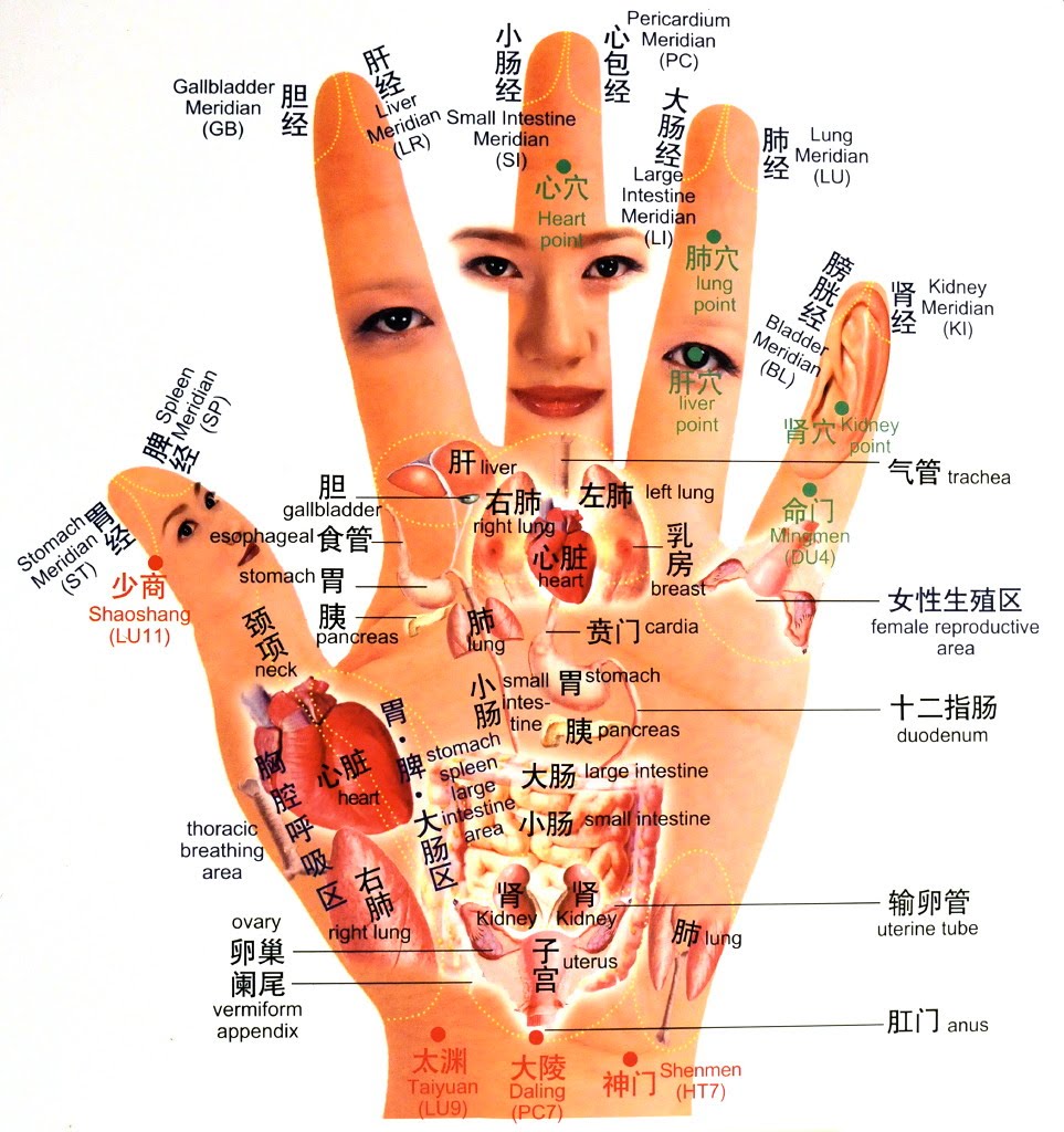 Στα μαξιλαράκια βρίσκουμε τα πλευρά και τον θώρακα ενώ κάτω από τον αντίχειρα έχουμε όλα τα όργανα της κοιλιάς. Πάγκρεας, στομάχι… Κάτω από τα μαξιλαράκια έχουμε το έντερο. Παράλληλα με τον αντίχειρα είναι η σπονδυλική στήλη.